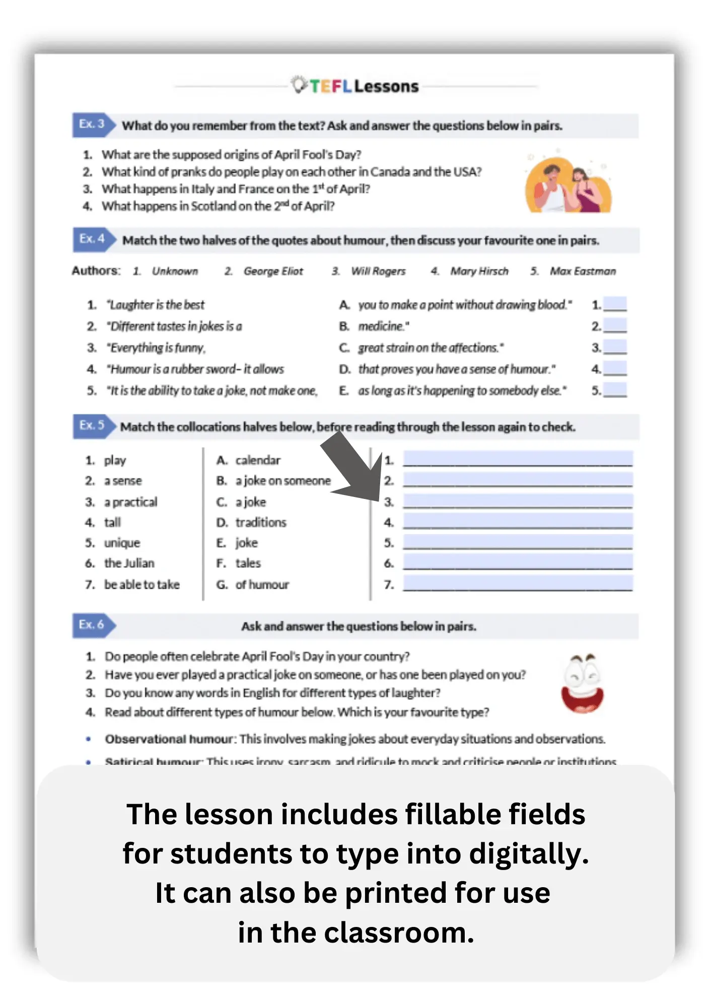 somdn_product_pageOur free April Fools Day ESL lesson is a fun and engaging B2/C1 reading and speaking lesson that explores the origins of this popular tradition and different types of humour. This ready-to-use English lesson includes a gap-fill reading, vocabulary tasks, and discussion activities, making it ideal for both in-class and online teaching.