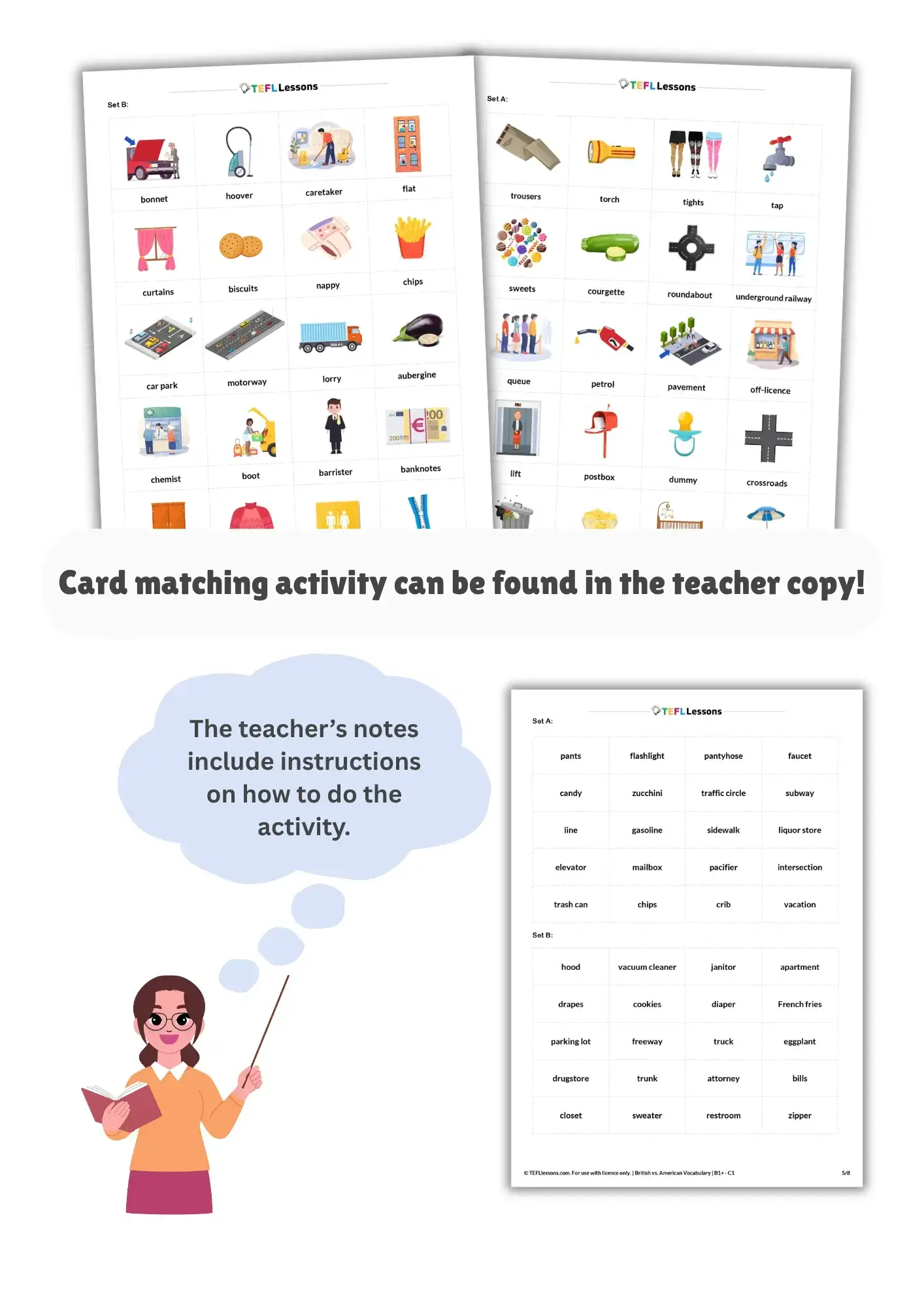 Students match British English vocabulary with American English equivalents using picture-based card sets. This interactive activity helps build recognition of common vocabulary differences.