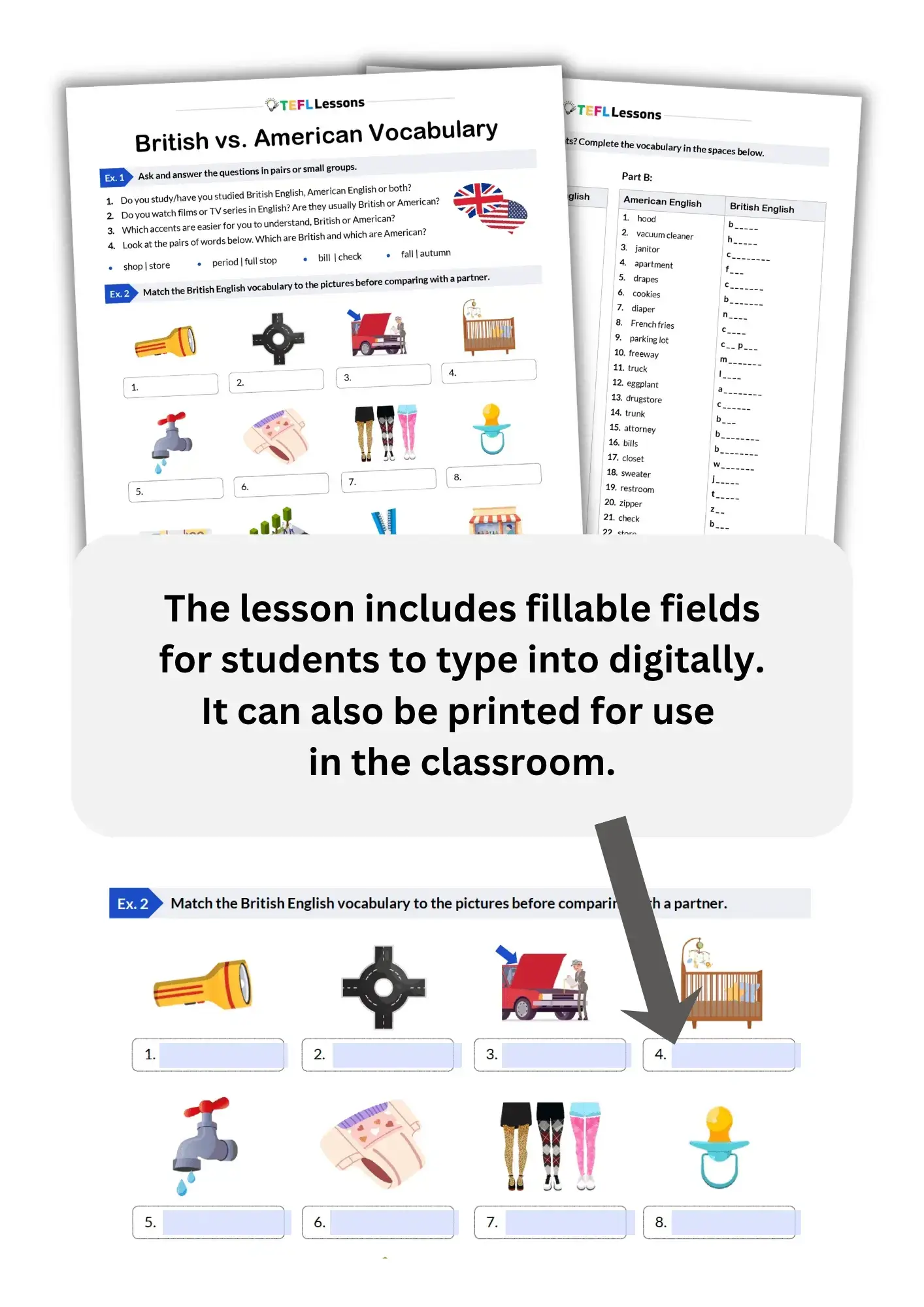 somdn_product_pageThis British vs American English worksheet is designed for teens and adults and helps students learn and practise key vocabulary differences between British and American English. It works well as a complete lesson plan or as part of a wider course and includes engaging exercises and a printable PDF format for flexible classroom and online use.