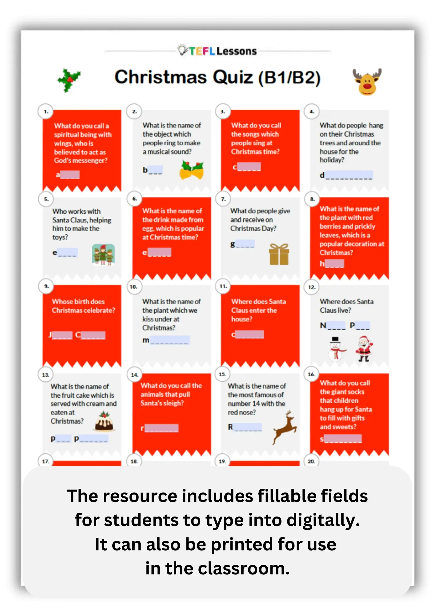 somdn_product_pageBring a festive challenge to your lessons with this Christmas Quiz (B1–B2), an engaging activity designed for intermediate and upper-intermediate ESL classes. Students answer a mix of vocabulary, grammar, and Christmas-themed knowledge questions that encourage discussion, quick thinking, and friendly competition. It’s suitable for adults or teens and works well as a warm-up, a fun holiday filler, or a full December lesson.