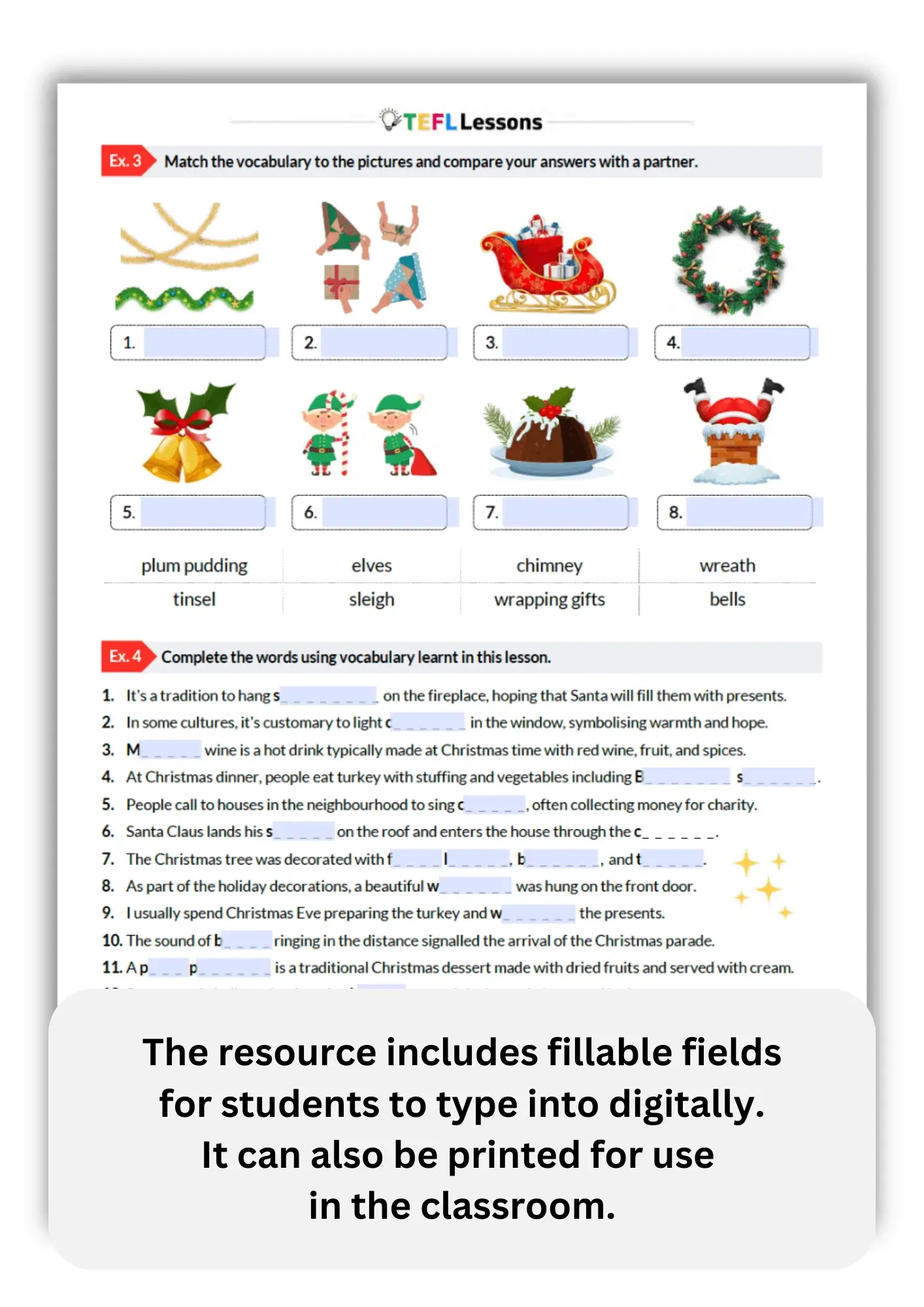 Help your intermediate learners review and extend their festive vocabulary with this Christmas vocabulary ESL activity. Designed for B1–B2 students, this worksheet introduces a wide range of seasonal words through clear visuals, guided practice, and contextualised tasks.