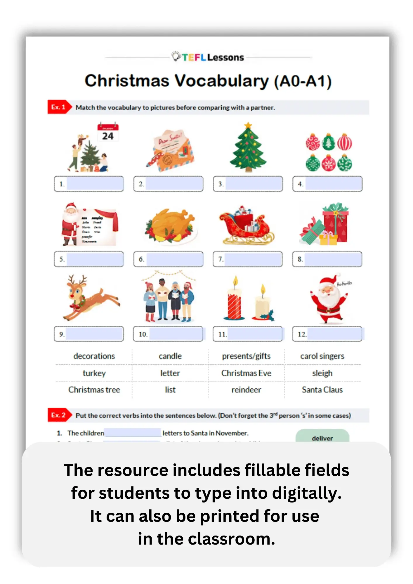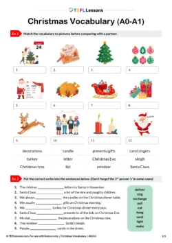 somdn_product_pageHelp beginner learners build essential festive language with this Christmas vocabulary for ESL worksheet. Designed for A0–A1 students, this easy, adult-friendly Christmas activity introduces key holiday words and provides controlled Present Simple practice to use the new vocabulary in context.