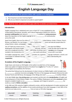 This English Language Day reading includes a reading text on English Language Day and the evolution of English, vocabulary focus, collocations matching, comprehension questions, and speaking practice.