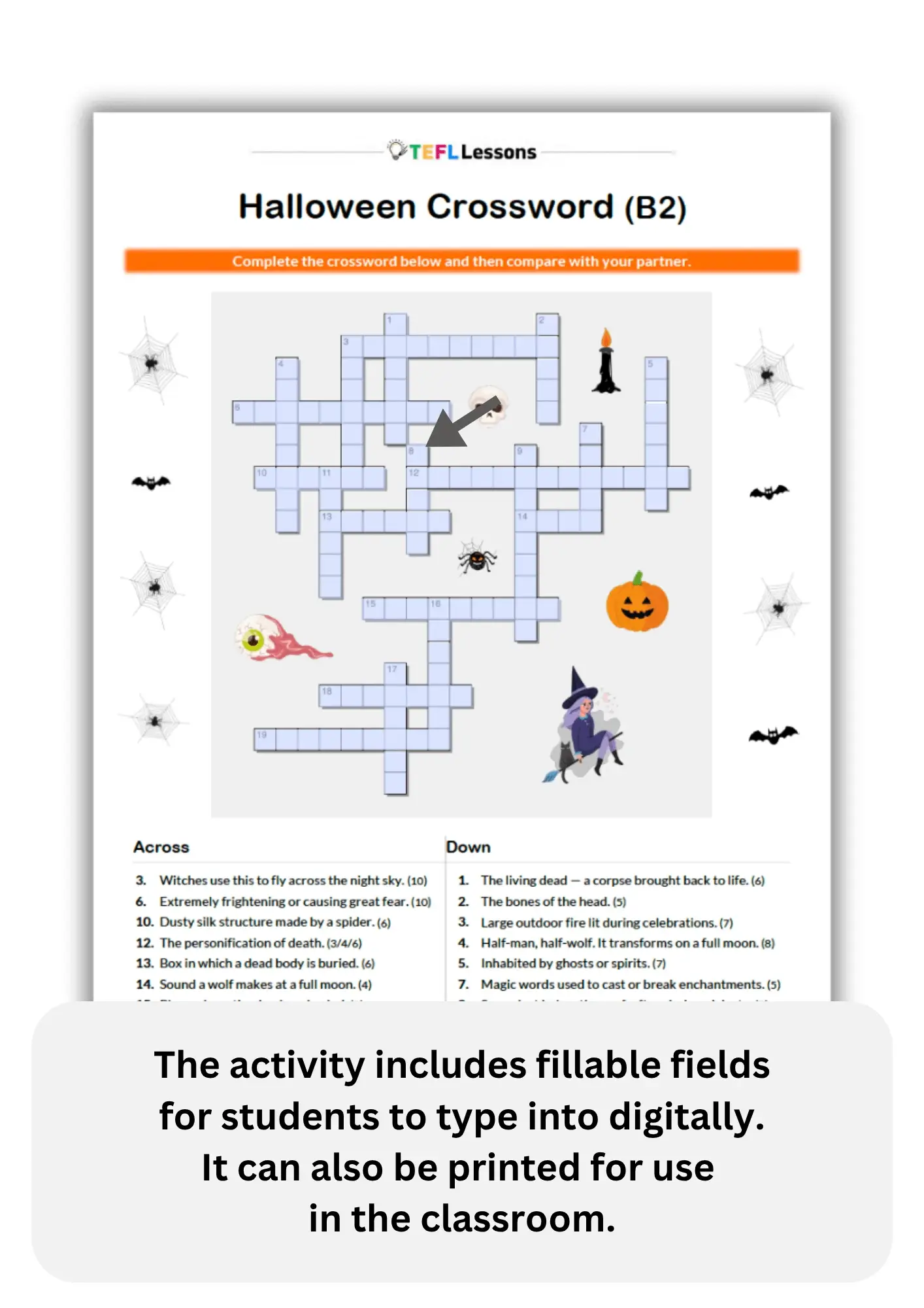 somdn_product_pageChallenge your upper-intermediate students with this FREE ESL Halloween crossword, a fun and engaging Halloween ESL game that reviews and consolidates advanced Halloween vocabulary in English. Learners solve descriptive clues to complete a challenging Halloween vocabulary crossword featuring words such as haunted, coffin, vampire, tombstone, terrifying, and broomstick.