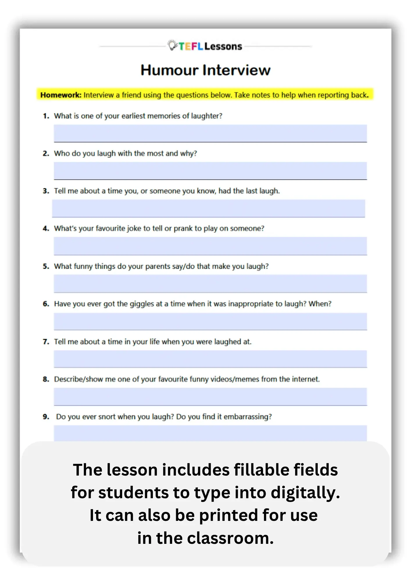 This activity features a set of funny ESL questions that encourage students to speak at length, build confidence, and improve vocabulary related to humour.