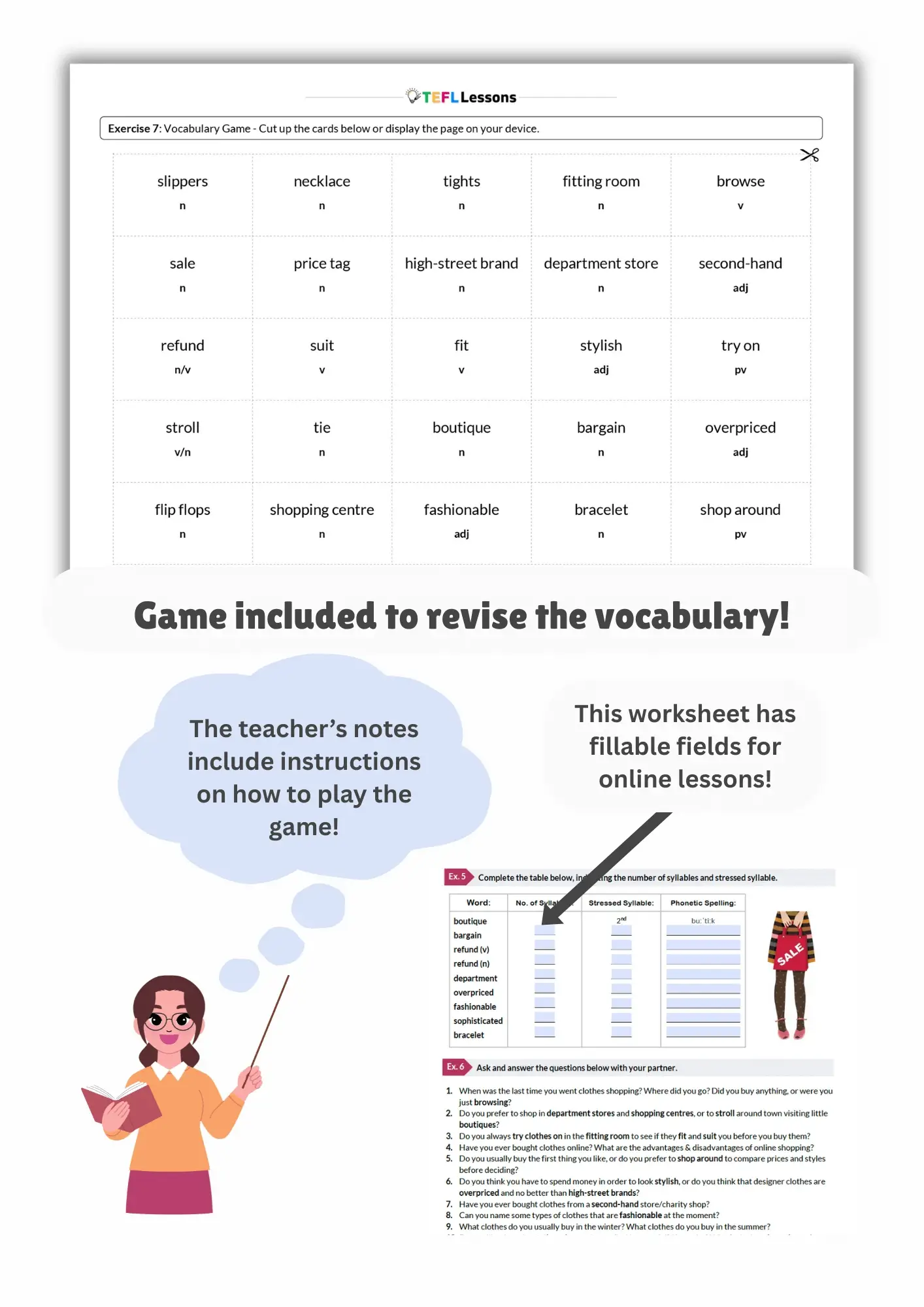 somdn_product_pageThis engaging ESL questions about shopping lesson helps students talk naturally about shopping for clothes, preferences, and opinions. Learners review key vocabulary and collocations such as high-street brands, shop around, and fitting room, practise pronunciation and word stress, and use adjectives like fashionable, stylish, and overpriced to describe shopping experiences.