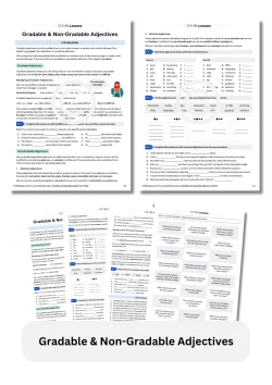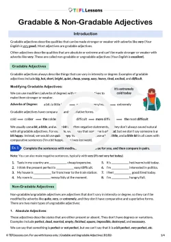 somdn_product_pageThis gradable and non-gradable adjectives lesson teaches students how to correctly use modifiers and intensifiers such as a bit, quite, very, really, and absolutely. Learners are introduced to gradable adjectives (e.g. cold, tired) and non-gradable adjectives, including extreme adjectives (e.g. freezing, exhausted) and absolute adjectives (e.g. perfect, dead).