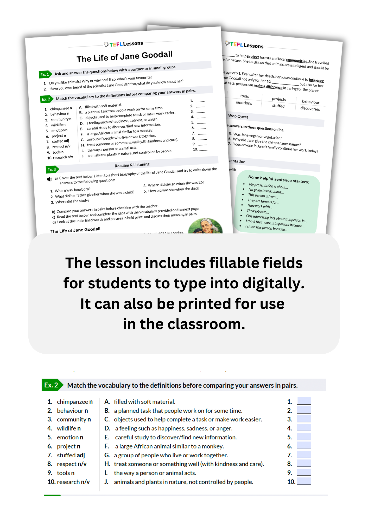Designed for strong A2 and lower B1 learners, the lesson combines a biography reading, a Jane Goodall listening activity, targeted vocabulary development, and communicative speaking practice. It works well as an integrated ESL listening lesson plan and can be used with teen or adult learners.