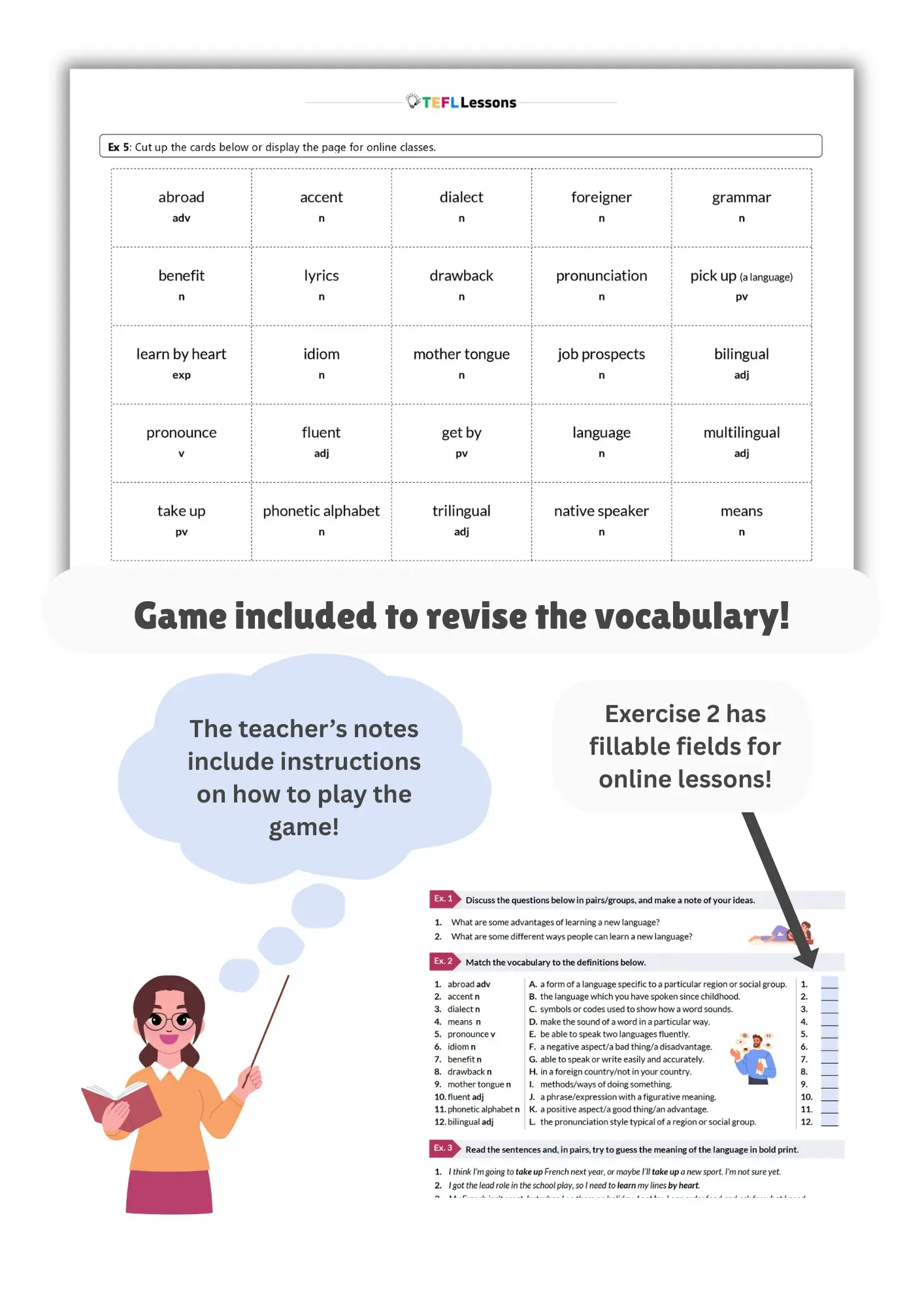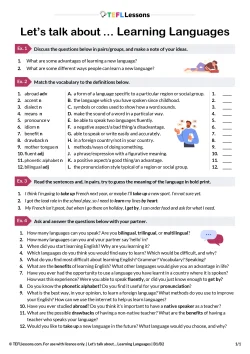 somdn_product_pageThis Learning Languages Speaking Lesson helps students build vocabulary about learning a language while improving fluency in speaking. It’s a fun, interactive activity that combines vocabulary practice with conversation tasks.