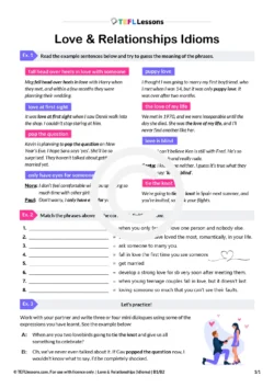 This is a Love and Relationships idioms lesson. Students study idioms connected to love and relationships in context and then match them to their definitions. Finally, they write mini dialogues to practise the idioms.