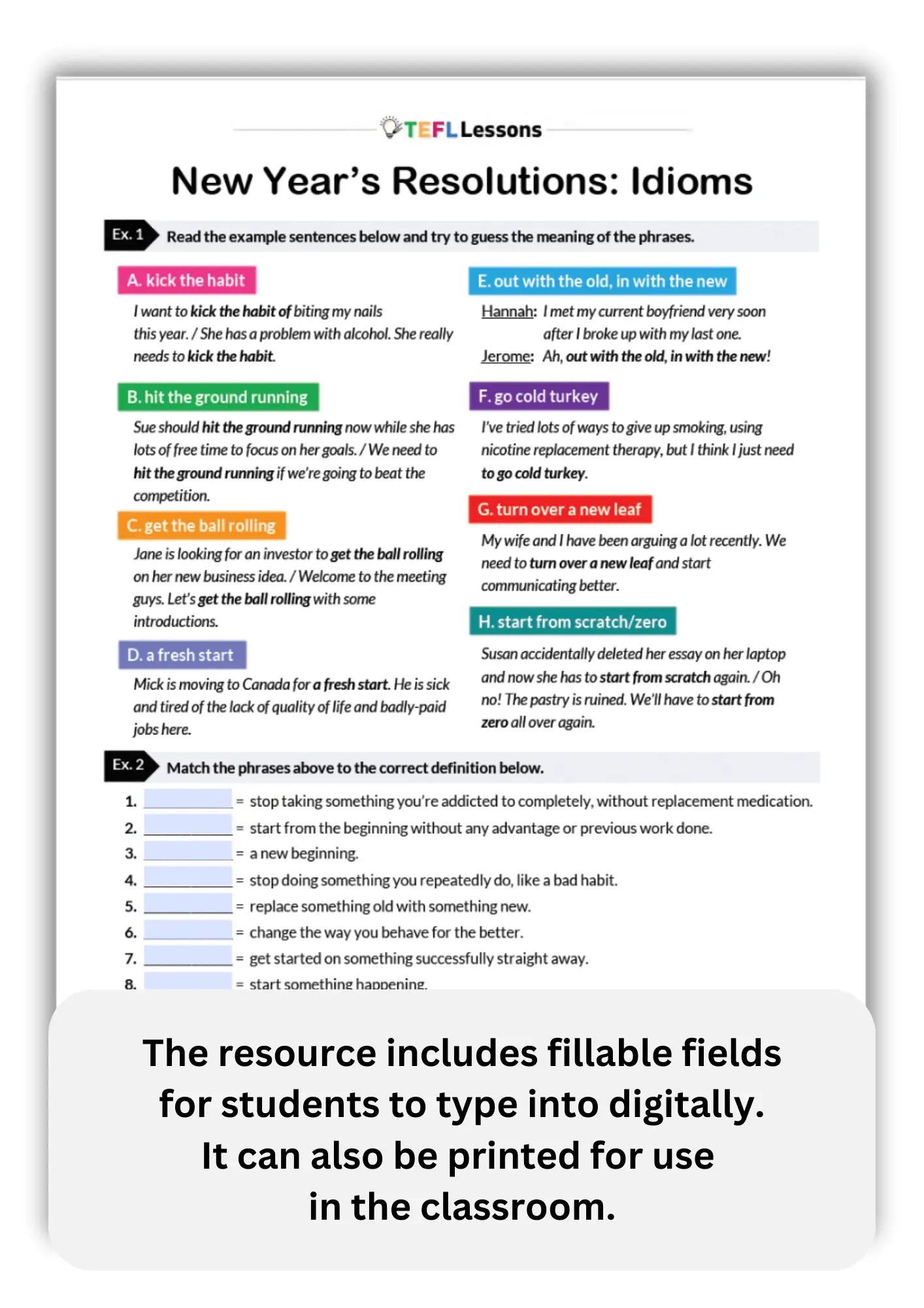 This New Year idioms lesson works well as a focused ESL vocabulary lesson in January, as part of a New Year-themed unit, or as a follow-up to speaking or discussion activities. It provides structured practice while still encouraging meaningful communication.