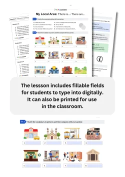 Students begin by identifying common places in a town through a vocabulary-image matching task. Next, they explore the rules and sentence structure of there is / there are, using clear examples and guided grammar practice.