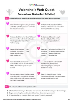 This WebQuest works well as a standalone speaking lesson or as part of a wider Valentine’s Day unit. It requires minimal preparation and is suitable for teen and adult ESL learners in classroom or online settings.