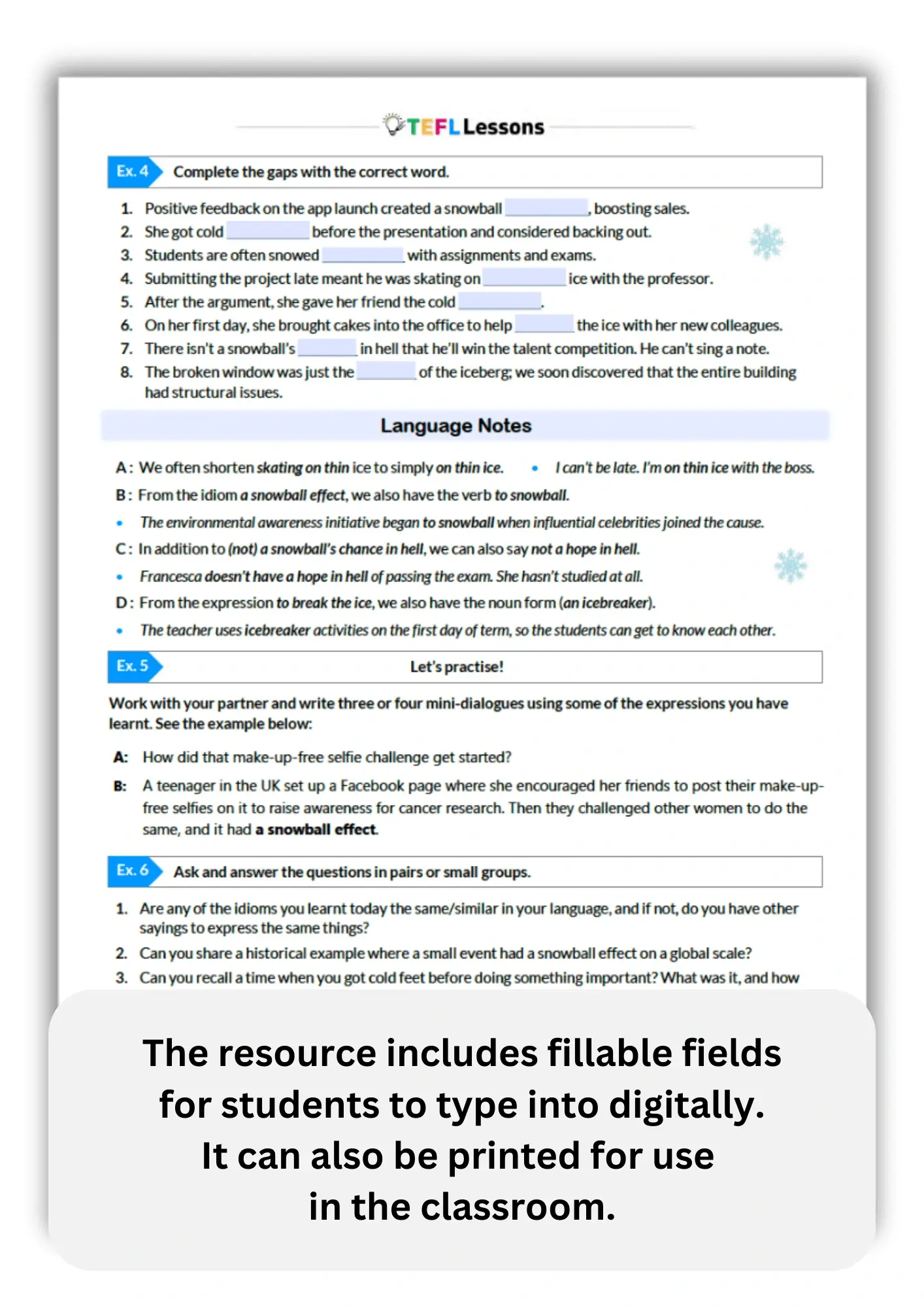 The worksheet then moves on to controlled practice, including a gap-fill exercise and a short language focus that highlights how these winter idioms English learners often find challenging are used in real sentences.